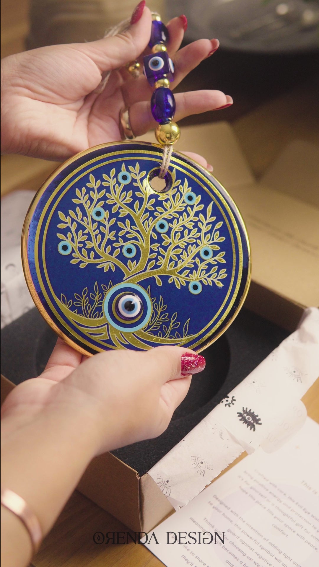 Evinizi ve sevdiklerinizi nazardan koruyun! 13.5 cm gerçek cam nazar boncuğu, geleneksel koruma enerjisini modern tasarım detaylarıyla birleştiriyor. Özel 18K altın detaylar, hem estetik hem de manevi açıdan eşsiz bir dekorasyon objesi haline getiriyor.